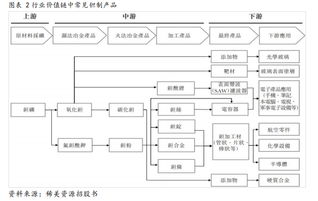 1、鉭鈮為稀有金屬,行業(yè)價(jià)值鏈主要分為上游(如采礦)、中游(如濕法火法冶煉、加工產(chǎn)品)、下游(如最終產(chǎn)品(如靶材、電容器)、應(yīng)用)。