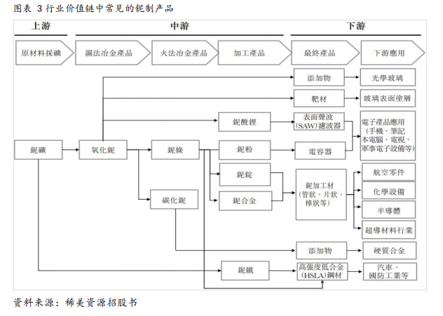 鈮行業(yè)價(jià)值鏈主要包括上游原材料(鈮礦)開采、中游濕法冶金產(chǎn)品(氧化鈮)、火法冶金產(chǎn)品(鈮條、碳化鈮)、加工產(chǎn)品(鈮酸鋰、鈮粉、鈮錠、鈮合金)、下游最終產(chǎn)品(添加物、靶材、電容器、鈮加工材等)以及應(yīng)用(電子產(chǎn)品、航空零件、半導(dǎo)體、超導(dǎo)材料、硬質(zhì)合金、汽車、國防工業(yè)等)。