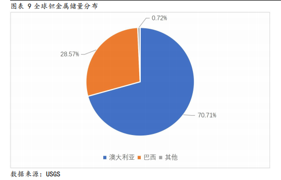 2、鉭鈮上游很集中。鉭礦主要分布于澳大利亞、巴西(二者合計(jì)占世界已探明儲(chǔ)量超90%),鈮礦比鉭礦更集中,巴西一家占全球超90%。供給端,非洲占全球鉭礦開采約七成,巴西鈮礦開采占全球近九成。