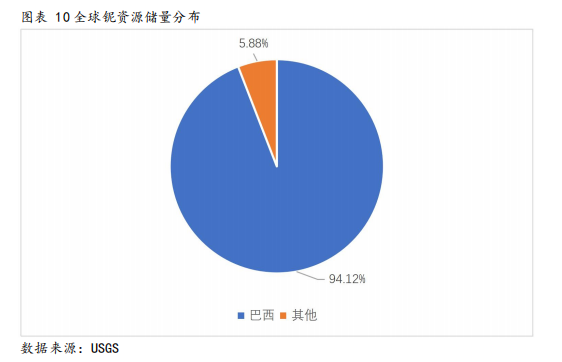 全球鈮資源儲(chǔ)量相比鉭更加集中。依據(jù) USGS 數(shù)據(jù),全球鈮儲(chǔ)量預(yù)計(jì)超過1700萬金屬噸,巴西探明鈮資源量約為 1600 萬金屬噸,占比高達(dá)94.12%。此外,全球范圍內(nèi)還有多 個(gè)國家擁有鈮礦床,包括安哥拉、澳大利亞、中國、格陵蘭、馬拉維、俄羅斯、南非和美國等,但由于鈮礦品味低、勘查程度低,儲(chǔ)量數(shù)據(jù)尚未被統(tǒng)計(jì)。