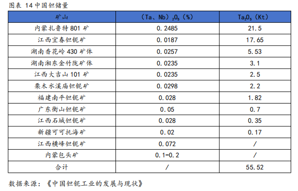 根據(jù)原寧夏東方有色金屬集團(tuán)的董事長何季麟先生2006年寫的《中國鉭鈮工業(yè)的現(xiàn)狀與發(fā)展》統(tǒng)計(jì),中國的鉭儲(chǔ)量為5.55萬噸,儲(chǔ)量最多的為內(nèi)蒙扎魯特 801礦,五氧化二鉭含量為 2.15萬噸,鉭鈮占礦石比例為 0.2485%,相對其他礦鉭鈮含量占比高,儲(chǔ)量第二的礦山為江西宜春鉭鈮礦,五氧化二鉭儲(chǔ)量為1.765萬噸,鉭鈮占礦石比例為 0.0187%,儲(chǔ)量第三的礦山為湖南香花嶺430礦體,五氧化二鉭儲(chǔ)量為 0.553 萬噸,鉭鈮占礦石比例為 0.0257%。