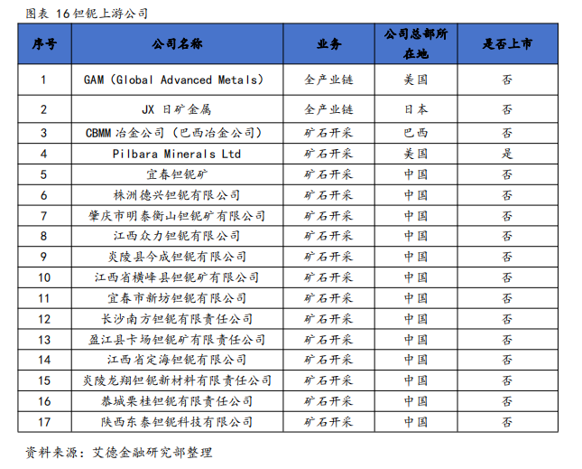 目前,在鉭鈮行業(yè)上游,全球大型公司包括GAM(Global Advanced Metals)、JX日礦金屬、CBMM冶金公司(巴西冶金公司)等。國內(nèi)公司包括宜春鉭鈮礦、株洲德興鉭鈮有限公司、肇慶市明泰衡山鉭鈮礦有限公司等。公開資料顯示,目前上游公司多數(shù)未上市。