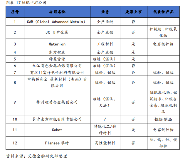 下游環(huán)節(jié),全球大型公司主要包括GAM(Global Advanced Metals)、JX日礦金屬、京瓷AVX、國巨、Vishay等。國內(nèi)公司主要包括東方鉭業(yè)、宏達(dá)電子、火炬電子、振華科技等。