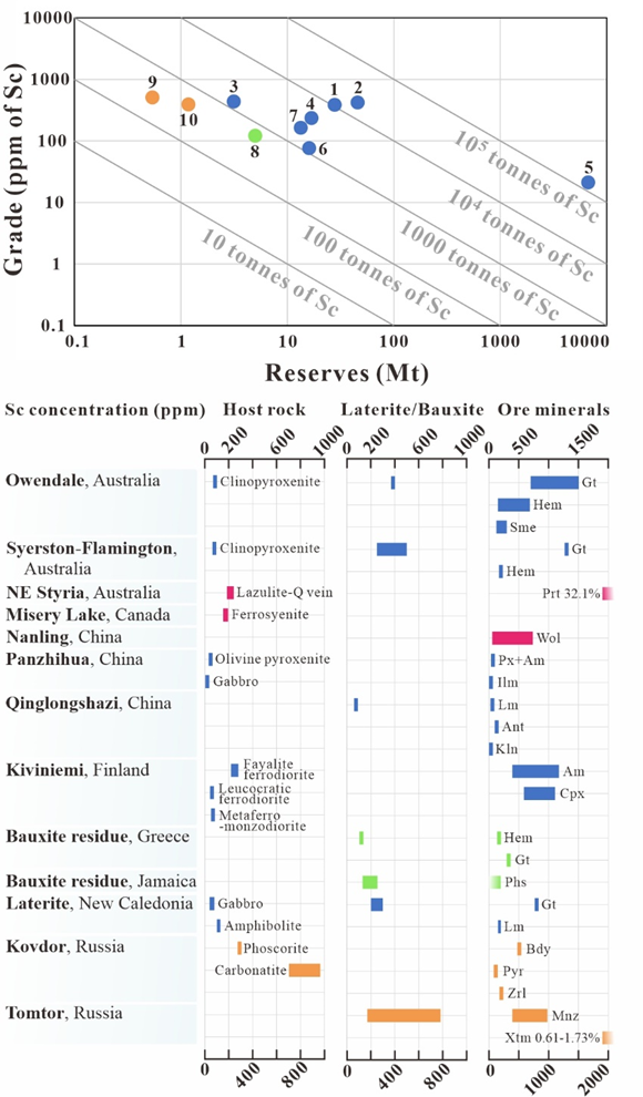 圖2 世界范圍內(nèi)典型的已知鈧礦床儲(chǔ)量、品位、圍巖及礦石鈧含量
