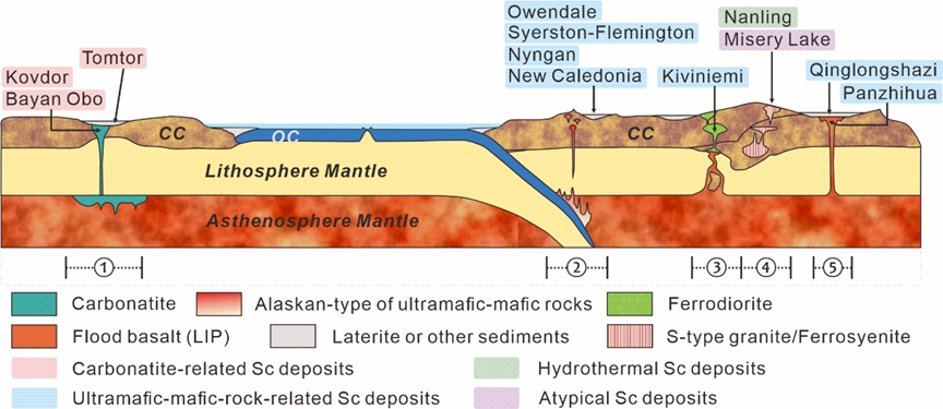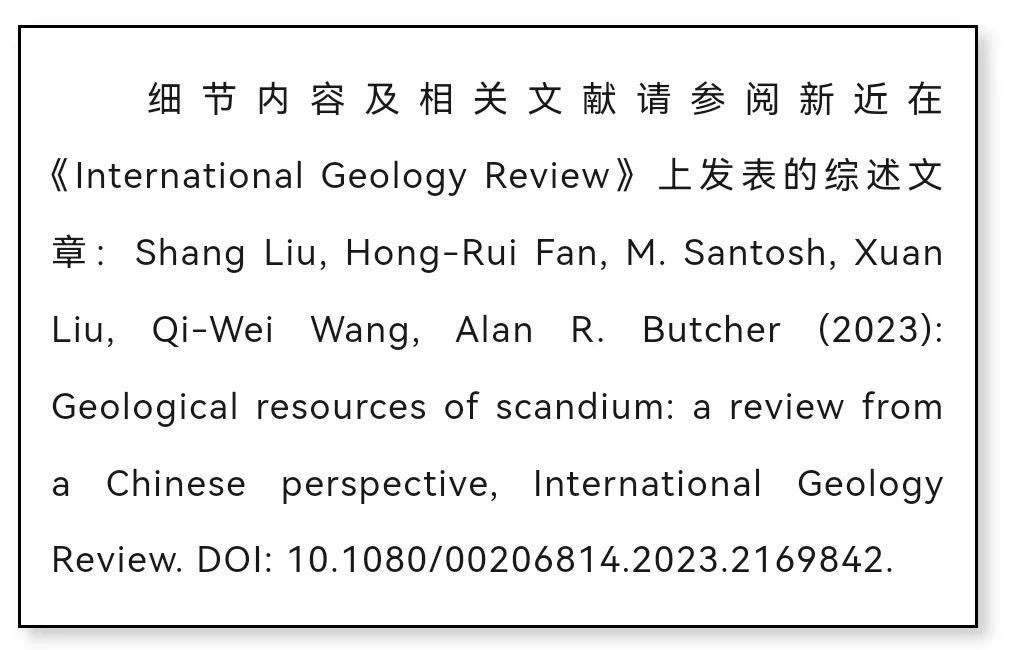 鈧(Sc)是巖石圈中的分散金屬,平均豐度為16-22 ppm(圖1)。因其廣泛應(yīng)用于固態(tài)燃料電池、鋁合金制造,并在激光晶體、濾波器等領(lǐng)域具有應(yīng)用前景,鈧被很多國(guó)家列入關(guān)鍵金屬或戰(zhàn)略金屬資源。目前鈧氧化物的全球年產(chǎn)量仍局限在數(shù)十噸,因此市場(chǎng)價(jià)格居高不下。隨著市場(chǎng)需求的增加,鈧資源的勘察、礦物學(xué)及礦床學(xué)研究以及應(yīng)用研究等也持續(xù)深入開展。基于已發(fā)表的文獻(xiàn),蘭州大學(xué)劉尚博士與中科院地質(zhì)地球物理所范宏瑞研究員等對(duì)鈧資源的礦床分類、典型富集過程和大地構(gòu)造環(huán)境等信息進(jìn)行了綜述。
