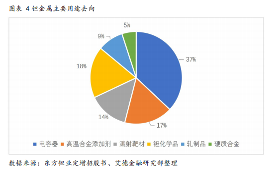 3、下游端,鉭鈮應(yīng)用廣泛。如鉭電容、高溫合金、鉭鈮氧化物、靶材、國防軍工、電子產(chǎn)品等。