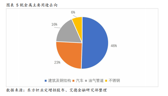 鈮廣泛應(yīng)用于鋼鐵、高性能合金(包括高溫合金)、超硬碳化物、超導(dǎo)體、 電子元器件和功能陶瓷等制造領(lǐng)域。其中建筑及大型鋼結(jié)構(gòu)應(yīng)用最多,占比達(dá) 46%,其次是汽車工業(yè),占比達(dá) 23%,油氣管道占比 16%,不銹鋼占比 6%。