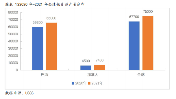 全球鈮資源產(chǎn)量主要來自巴西。依據(jù)USGS數(shù)據(jù),2021年全球鈮資源生產(chǎn)量約7.5萬金屬噸,其中巴西的產(chǎn)量約為6.6萬金屬噸,約占全球總產(chǎn)量的88%,加拿大產(chǎn)量約7400金屬噸,約占全球總產(chǎn)量的9.9%。
