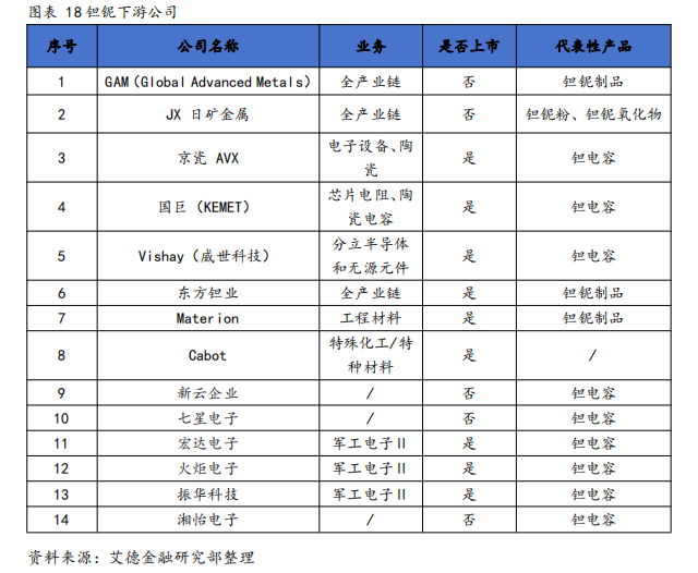 下游環(huán)節(jié),全球大型公司主要包括GAM(Global Advanced Metals)、JX日礦金屬、京瓷AVX、國巨、Vishay等。國內(nèi)公司主要包括東方鉭業(yè)、宏達(dá)電子、火炬電子、振華科技等。